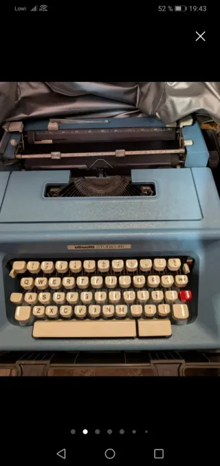 Máquina de escribir antigua de la marca Olivetti, modelo Studio 44. Un clásico para coleccionistas o amantes de lo vintage. - Color gris verdoso. - Teclado QWERTY. - Se dispone de funda.