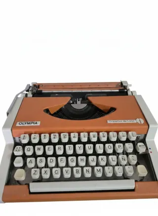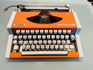 Máquina de escribir Olympia Traveller de Luxe en color naranja y blanco. Un clásico para coleccionistas o para quienes buscan un toque vintage. - Diseño retro. - Teclado QWERTY.