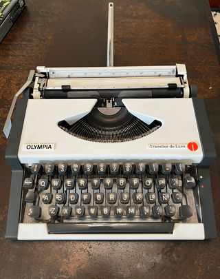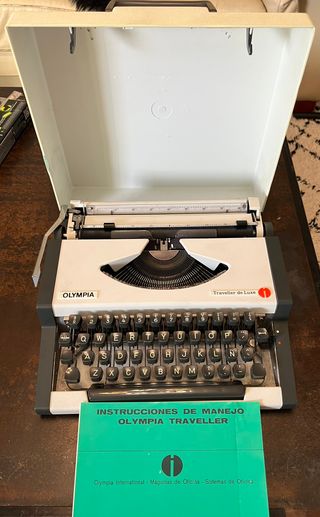 Máquina de Escribir Olympia Traveller de Luxe - Vintage con Estuche y Manual ¡Vendo esta joya vintage para los amantes de lo retro! Se trata de una máquina de escribir Olympia Traveller de Luxe, en excelente estado, perfecta para coleccionistas, escritores o como pieza decorativa. Incluye su estuche original y el manual de instrucciones en español. Funciona perfectamente, con todas las teclas operativas y un diseño clásico que evoca nostalgia. Ideal para escribir, decorar tu espacio o como regalo único. La he cuidado con mucho cariño, ¡lista para que alguien más le dé vida! Recogida en mano en Madrid o envío.