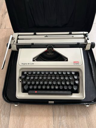 Máquina de escribir AEG Olympia Regina de Luxe en perfecto estado. - Diseño clásico en color crema. - Teclado QWERTY con caracteres en español. - Muy poco uso en su día. - Incluye su maletín de transporte original negro en perfecto estado. - Incluye cinta de repuesto.