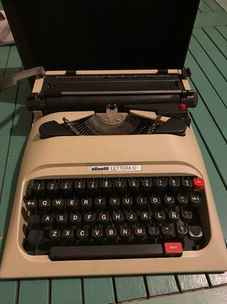 Máquina de escribir portátil de la marca Olivetti, modelo Lettera 12. Su diseño clásico la hace un objeto decorativo. - Color blanco. - Teclado QWERTY con Ñ. - Incluye funda protectora.