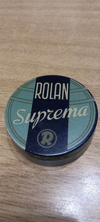 Caja de hojalata de ROLAN Suprema. de Maquina de escribir. 6,7 cm de diámetro. Hojalata litografiada 6,7 cms diámetro x 2,1 alto. cms