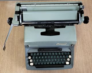 Máquina de escribir vintage Hispano Olivetti Pluma 22, Impecable, un clásico de los años 60. - Diseño retro en color verde pálido. - Teclado QWERTY con caracteres en español (incluye Ñ). - Ideal para coleccionistas o como pieza decorativa.