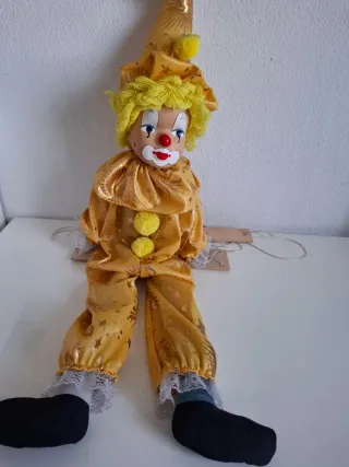 Marioneta de payaso con vestimenta de satén negro y detalles dorados. Ideal para coleccionistas o decoración. - Traje negro con estampado dorado. - Gorro de payaso. - Cuerdas para colgar y mover.