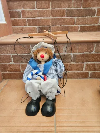 Marioneta de Payaso de Madera con hilos. Está fabricada en madera y vestida con ropa de tela detallada (pantalones de cuadros y chaqueta roja). Está en buen estado, los hilos están desenredados y el mando de madera funciona perfectamente. Si los hilos se entedn, es fácil desenredar los, desenroscado las argollas que llev aen sus manos y volviéndolos a colocar👌. Es ideal para coleccionistas de juguetes antiguos o para que los niños jueguen.