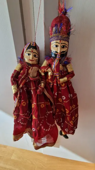 Par de marionetas tradicionales de la India, elaboradas con gran detalle. - Vestimenta de tela roja con adornos dorados. - Rostros pintados a mano. - Ideales como pieza decorativa o para coleccionistas.