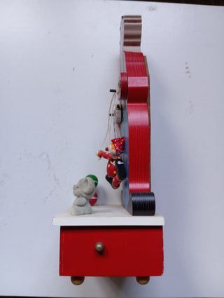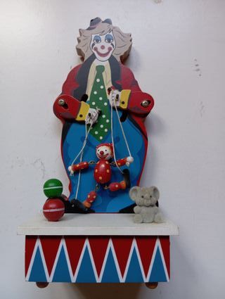 Caja musical con un diseño de payaso y marioneta. - Figura de payaso principal con traje de chaqueta y corbata. - Marioneta de payaso colgante con detalles en rojo y blanco. - Base decorada con un diseño de circo en rojo, azul y blanco. - Incluye una pequeña figura de un osito gris. - Dos pelotas apiladas, una verde y otra roja, sobre la base.