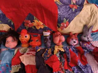Conjunto de 7 marionetas vintage de estilo ruso. Incluye varias figuras de animales y una muñeca. Incluye caja original - Diseños coloridos y alegres. - Materiales variados, incluyendo plástico y tela. - Ideal para coleccionistas o decoración.