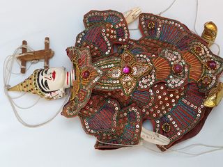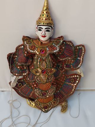 Antigua marioneta de cuerdas tailandesa artesanal,en madera policromada y traje en tela decorada con pedrería y lentejuelas. Medida aproximada de alto 46 cm (sin cuerda). En bastante buen estado.