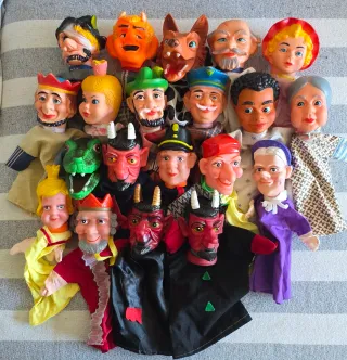 Conjunto de marionetas de guiñol antiguas, perfectas para coleccionistas o para revivir la magia del teatro de títeres. - Variedad de personajes. - Diseños clásicos.