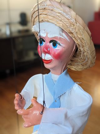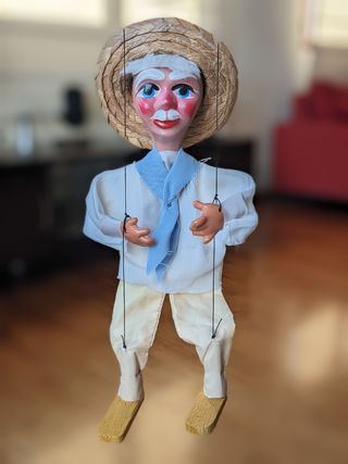 Marioneta de payaso con cabeza de cerámica pintada, cuerpo de madera y plástico, y ropa y complementos de tela y esparto. Elaborada de manera artesanal en los años 80.
