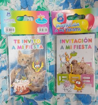 Dos paquetes de tarjetas de invitación para fiestas. - Un paquete con diseño de cachorros y personajes animados. - Otro paquete con diseño de gatitos y pastel. - Ambos paquetes incluyen el texto Invitación a mi fiesta o Te invito a mi fiesta. 13.5cm X 8.5cm.