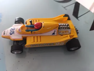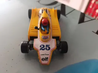 Coche de slot Ligier Exin, modelo de competición. - Diseño deportivo en color amarillo. - Detalles como el número 25 y patrocinadores. -lmotor visible en la parte trasera. Le falta el alerón