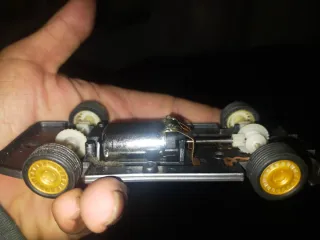 Chasis de coche Scalextric con motor y ruedas. - Incluye motor. - Ruedas delanteras y traseras. - Chasis negro. - Comprobado y funcionando correctamente