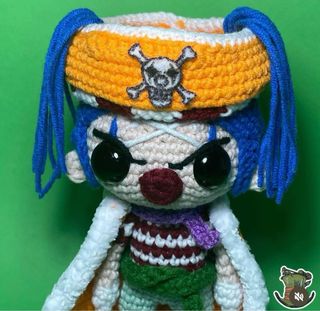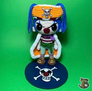 Figura de crochet del personaje Buggy de One Piece. Ideal para coleccionistas. - Diseño detallado del personaje. - Colores vibrantes. - Base decorativa con emblema. Hecho a mano