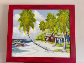 Pintura estilo naif que representa una escena costera de la República Dominicana. 58cm x 68cm - Palmeras y cabañas en la playa. - Barcas en el mar. - Marco rojo.