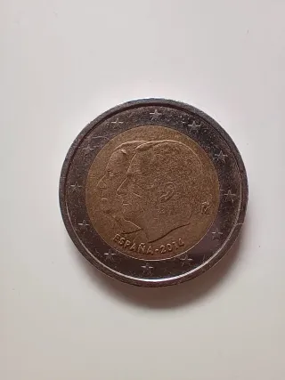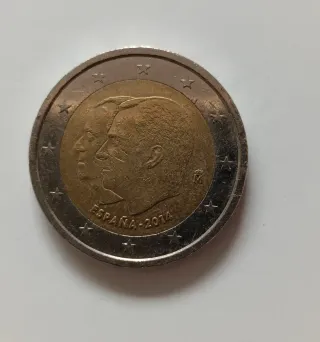 Moneda de 2 euros conmemorativa de España del año 2014. - Diseño con los perfiles de los reyes Juan Carlos I y Felipe VI. - Inscripción ESPAÑA 2014. - Borde con estrellas y motivos decorativos.Para coleccionistas.