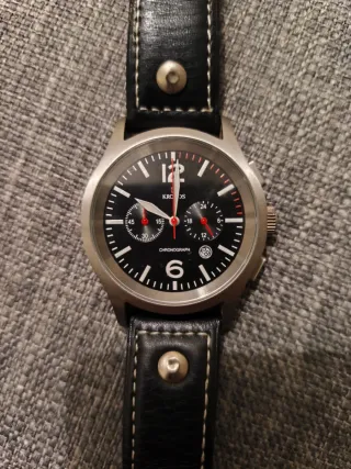 Reloj de pulsera de la marca Kronos con diseño cronógrafo. Kronos, quizás la mejor marca española. - Correa de piel negra. - Esfera negra con detalles blancos y rojos. - Cierre de hebilla.