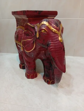 Figura decorativa con forma de elefante, elaborada en porcelana. Alto 41 cm Largo 54 cm Ancho 22 cm - Diseño en color granate con detalles dorados. - Acabado brillante y ornamentado.