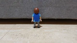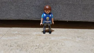 Figura de Playmobil representando a un policía. - Chaleco azul con emblema. - Pantalones grises. - Botas negras.