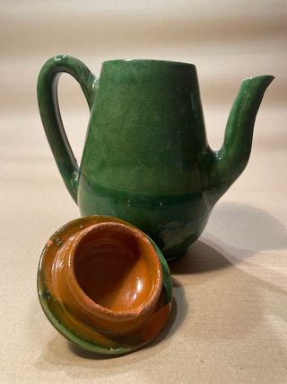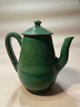 Bonita jarra de cerámica esmaltada en color verde, de estilo artesanal. Presenta un diseño clásico con cuerpo abombado, asa amplia, pico vertedor y tapa original con pomo. El esmalte tiene ligeras variaciones de tono que le aportan carácter y autenticidad. No tiene marca ni firma en la base, lo que sugiere una pieza de taller o cerámica tradicional. Ideal como elemento decorativo para cocina rústica, vitrina o colección, aunque también puede utilizarse como jarra decorativa.