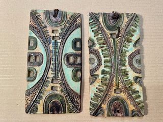 Conjunto de fragmentos de cerámica mural artística, firmados en el reverso “Fet a la Magret Vega”, realizados en barro rojo esmaltado con relieves geométricos y acabados en tonos verdes y tierras. Pieza de autor, trabajo artesanal, probablemente perteneciente a un mural decorativo de los años 60–70, de clara influencia mid-century / brutalista, muy decorativa como objeto de arte mural 🔹 Cerámica no industrial 🔹 Estilo moderno / abstracto 🔹 Firmada 🔹 Procedencia catalana 🔹 Ideal para decoración vintage o coleccionistas Estado: original, con marcas del tiempo acordes a su antigüedad (ver fotos).