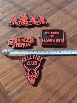 - Llaveros temáticos de Stranger Things. - 5€ dos unidades a elegir 5€x2 unidades - Diseño de Hellfire Club con calavera y cuernos. - Llavero con siluetas de personajes en bicicleta. - Llavero con letrero Welcome to Hawkins.