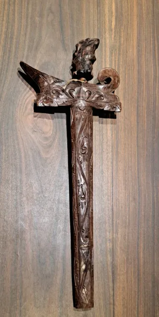 Antigua Keris Kris de Bali, Lombok, Indonesia. Una pieza de colección con un diseño intrincado. - Elaborada con madera oscura. - Presenta tallas detalladas en la empuñadura y la hoja. - Representa figuras y motivos tradicionales. Antigua Keris Kris Bali Lombok Indonesia - Vaina tallada a mano - Hoja Pamor - Arte tribal de principios del siglo XX. 28.3