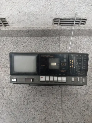 Dispositivo multifunción que combina radio, reproductor de cassette y televisión. - Diseño compacto y portátil. - Antena extensible para mejor recepción. - Controles de volumen y sintonización. - Botones de reproducción y grabación para cassette.