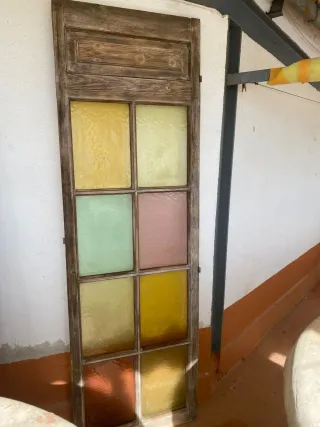 Puerta antigua con paneles de cristal de colores. - Marco de madera envejecida. - Cristales en tonos amarillo, verde y rosa. - Diseño de estilo vintage.