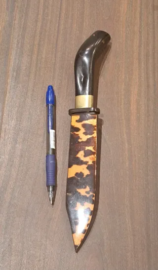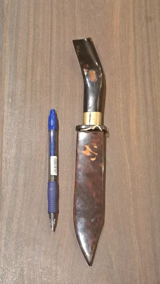 Cuchillo artesanal de origen indonesio con un diseño distintivo. - Empuñadura curva de material oscuro. - Hoja sin filo - Guarda - Funda natural