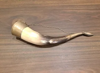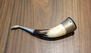 Auténtico cuerno de caza vintage, de origen francés. Su diseño curvo y material le otorgan un carácter único. - Fabricado en cuerno natural con detalles en metal. - Acabado con un tapón metálico en un extremo.