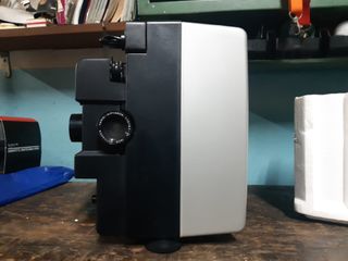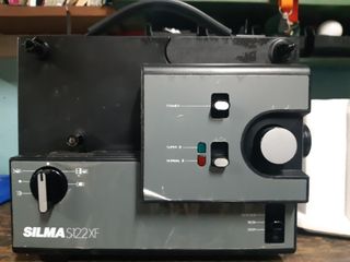 Proyector de cine SILMA S122 XF. - Selector de velocidad de avance: SLOW B/B, 16-24, STOP. - Selector de función: FRAMER, SUPER 8, NORMAL 8. - Dial de enfoque. - Selector de iluminación. - Desgastado por el tiempo no por el uso.