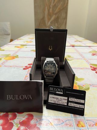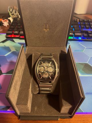 Reloj Bulova Curv Cronógrafo. - Modelo: 96A257 - Calibre: Cuarzo, la pila esta recién cambiada. - Diámetro: 42mm - Armis de acero inoxidable - Cristal de zafiro. - Bisel acero inoxidable. - Cierre de pliegue con dos botones, uno en cada extremo. IMPORTANTE: 📌 Subesfera inferior cuenta los segundos. 📌 Subesfera lateral derecho cuenta los minutos. 📌 Subesfera izquierda cuenta las horas. - Resistencia al agua 3 ATM. - Estuche original y certificado. - Garantía convencional de 2+1 años. - Fecha de adquisición: 14/01/2022.