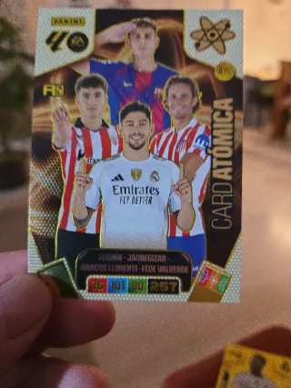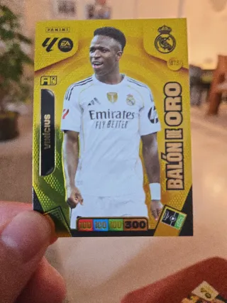 Tarjeta coleccionable Panini Card Atómica + Balón de Oro Vinicius. - Diseño con detalles dorados y gráficos de átomos.