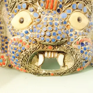 Máscara decorativa tibetana antigua Presenta un diseño intrincado y detallado. - Elaborada con metal y adornada con piedras de colores. - Representación facial con múltiples ojos y boca. - Detalles ornamentales en la parte superior y los laterales.