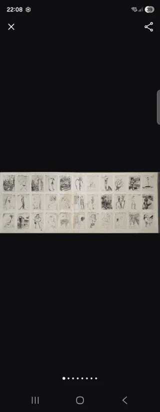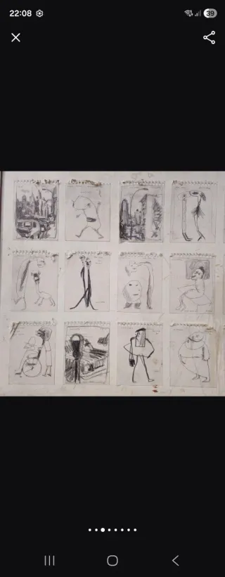 Cuadro original de Joan Cruspinera. Composición formada por múltiples dibujos a lápiz y tinta. Obra de estilo expresionista y contemporáneo. Conjunto de bocetos figurativos y urbanos. Gran formato de 47 x 120 cm. Trabajo muy interesante a nivel artístico y decorativo. Firmado en varias viñetas. Pieza ideal para coleccionistas o amantes del arte. El soporte presenta desgaste por el paso del tiempo. Se aprecia una mancha en la zona central del cuadro. El estado general es el que se muestra en las fotos. Marco de aluminio sin cristal Obra única. Precio negociable