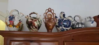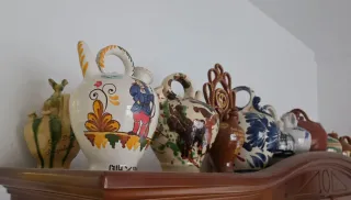 Conjunto de 14 càntirs / botijos de cerámica de Argentona. Cada pieza es única y presenta diseños variados. - Càntir con figura de hombre vestido. - Càntir con decoración floral. - Càntir con esmaltado verde y blanco. - Etc... El precio es unitario, pero se puede negociar. Solo entrega en mano. Lo que se ve en las fotos.