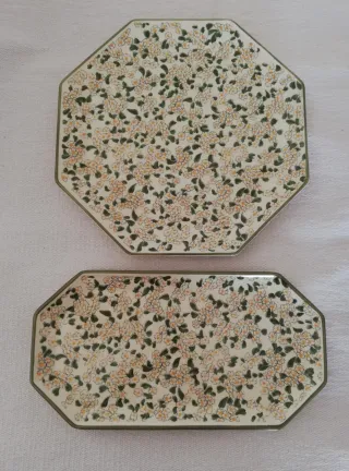 Conjunto de dos piezas de cerámica de la marca alemana Zeller. Serie Denise Plato de forma octogonal de 30, 5 x 30, 5 cm Bandeja de forma rectangular con bordes biselado de 33,5 cm de largo x 17,5 cm de ancho Diseño floral con flores blancas y hojas verdes. Tienen sus años, ningún desconchon. No se envia Más artículos en mi perfil