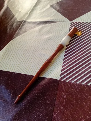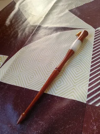 Portaplumas oblicuo de madera con detalles en blanco y dorado. - Mango de madera. - Cuerpo central blanco. - Punta metálica dorada.