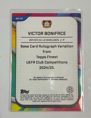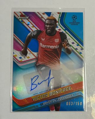 Tarjeta de autógrafo certificada de Victor Boniface de Topps Finest. - Edición limitada /150. - Incluye el logo de la UEFA Champions League. - Jugador del Bayer 04 Leverkusen.
