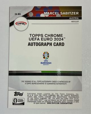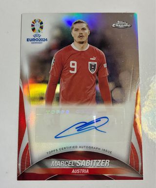 Tarjeta de colección de Marcel Sabitzer con autógrafo de Topps Chrome. - Edición UEFA Euro 2024 Alemania. - Autógrafo certificado por Topps. - Diseño brillante y llamativo.