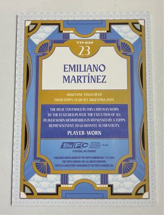 Tarjeta de colección de Dibu Martínez de Topps con un parche de jugador. - Parche de jugador. - Diseño de Topps.