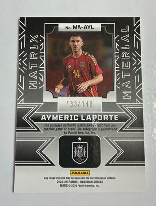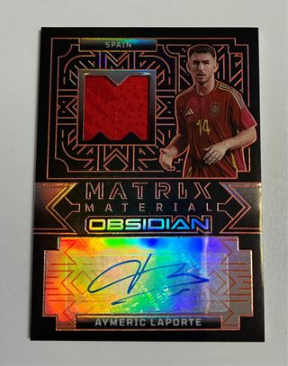 Tarjeta de colección de Aymeric Laporte de la serie Obsidian Matrix. - Incluye un fragmento de jersey (patch). - Autografiada por el jugador. - Edición limitada a 149 unidades.
