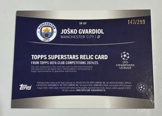 Tarjeta de colección de Joško Gvardiol de Manchester City. - Edición limitada /299. - Incluye un parche de jugador. - Diseño de Topps.