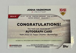 Tarjeta de colección de Josha Vagnoman de Topps Chrome. - Edición Certified Autograph Issue. - Incluye el logo RC (Rookie Card). - Muestra el escudo del VFB Stuttgart y el logo de la Bundesliga.