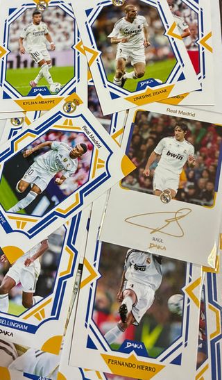 Lote de 20 tarjetas Daka de la temporada 25-26 del Real Madrid. Incluye jugadores como Kylian Mbappé, Zinedine Zidane, Raúl, Fernando Hierro y Bellingham. - Tarjetas coleccionables del Real Madrid. - Edición Daka 25-26. - Incluye varios jugadores icónicos.