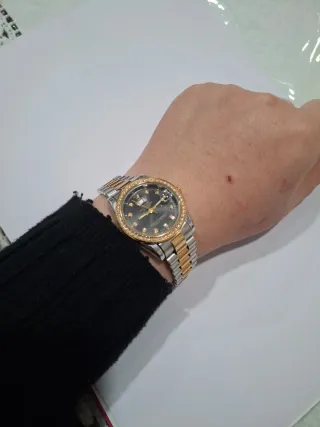 Elegante reloj de pulsera con un diseño clásico y detalles brillantes. - Bisel adornado con diamantes. - Correa de acero inoxidable y oro. - Esfera oscura.