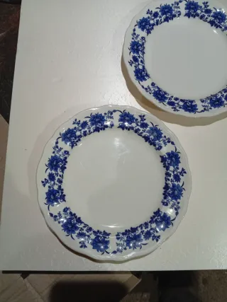 2 unidades: precioso plato de porcelana antigua española de la marca San Claudio. Presenta un delicado diseño floral en color azul. - Borde ondulado. - Motivo floral azul.