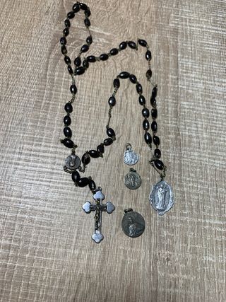 Conjunto de medallas religiosas, un rosario y una pulsera. - 49 medallas de diferentes tamaños y diseños. - Un rosario con cuentas negras y detalles - Una pulsera de perlas blancas.